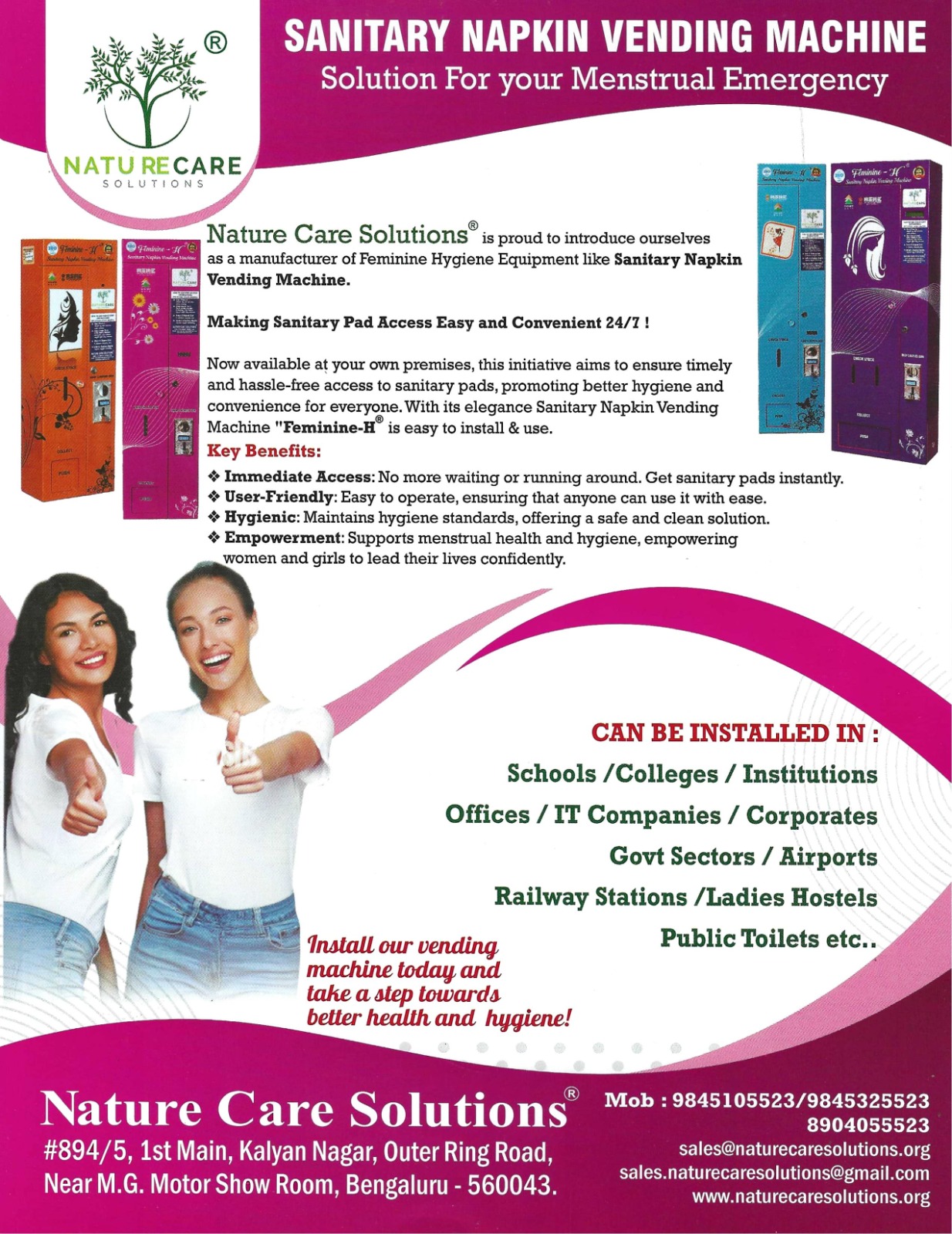 Established in 2014, Nature Care Solutions is a dedicated manufacturer based in Bengaluru, Karnataka, India, committed to providing innovative and essential washroom hygiene solutions. Operating under our distinct brand name Feminine-H, we specialize in a unique product range that is not commonly available in India, including Sanitary Napkin Vending Machines, Sanitary Pad Vending Machines, Sanitary Napkin Dispensers, Sanitary Napkin Incinerators, and Waterless Urinals. With over 11 years of experience in manufacturing, we have successfully completed more than 500 projects across various sectors, ensuring the highest standards of quality, reliability, and customer satisfaction in all our endeavors.